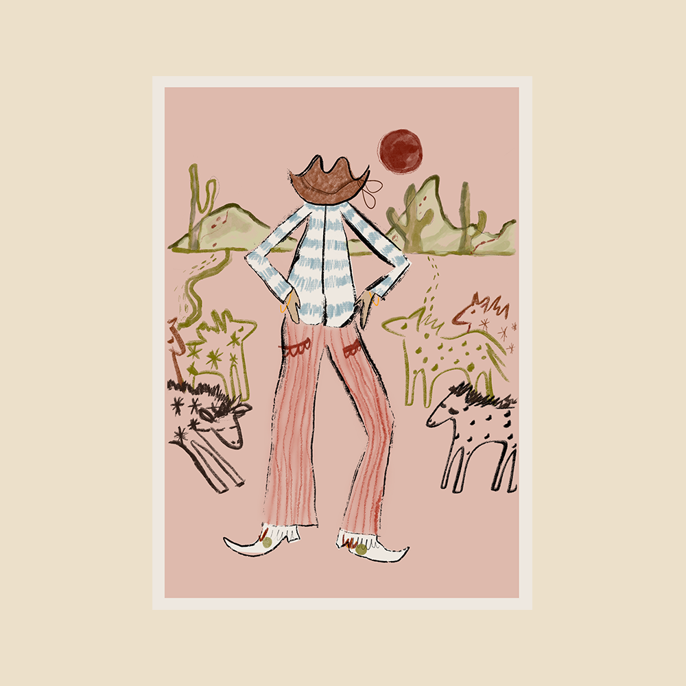 'Where You Go, I Go' Print 'On My High Horse (And Coming to Collect You)' Print 'Wild Bill's' Cowboy Print 'Here Comes Mr Moonlight!' Cowboy Print 'As If You Were There' Desert Print 'Daffodil Phil' Print 'To Bluer Skies' Print 'I Didn't Put On My Bouclé Shirt for Nothing!" Cowboy Print 'Desert Dance' Cowboy Print 'A Windy Day in the Desert' Print 'Flowers On A Vase' Print